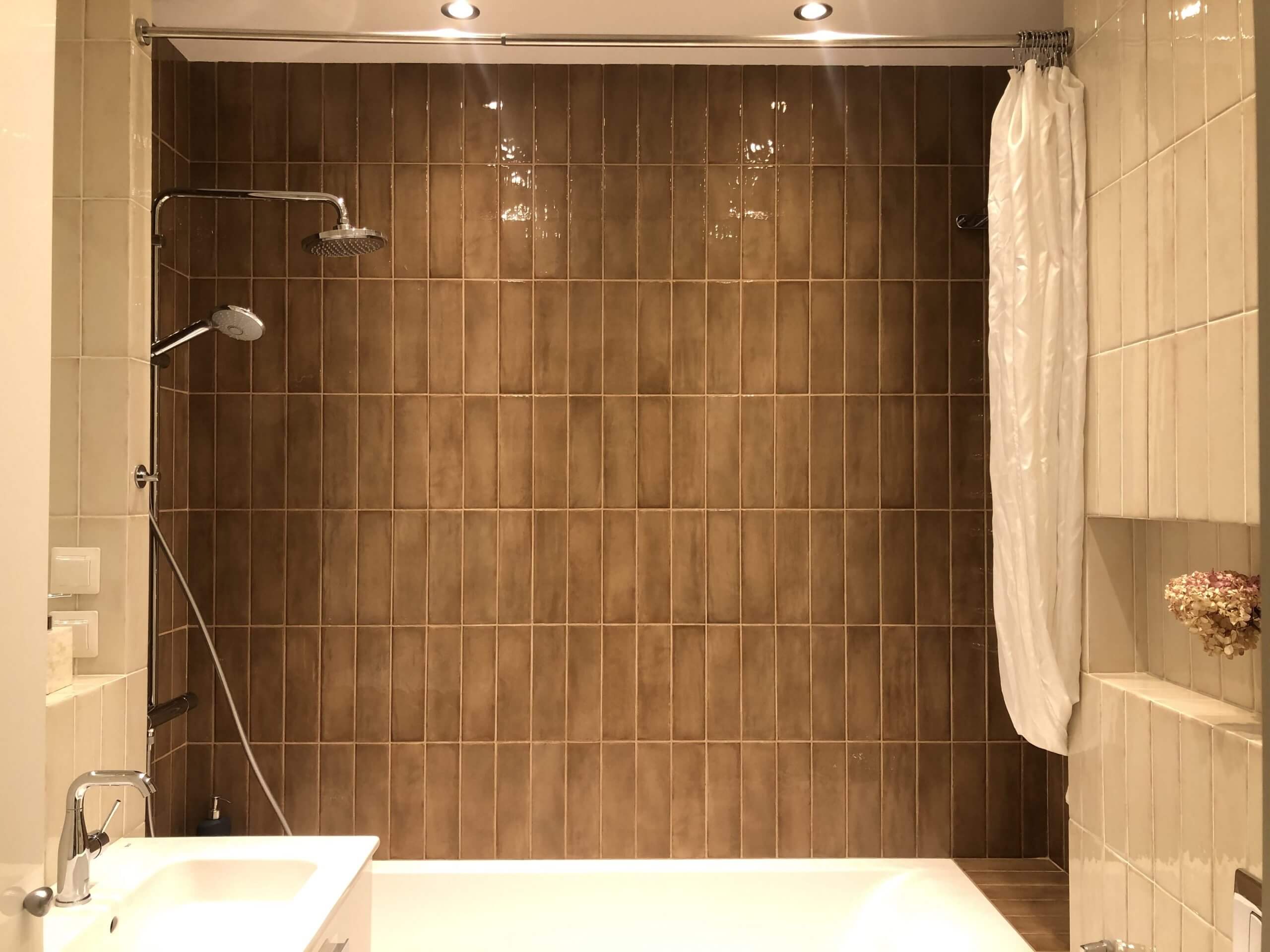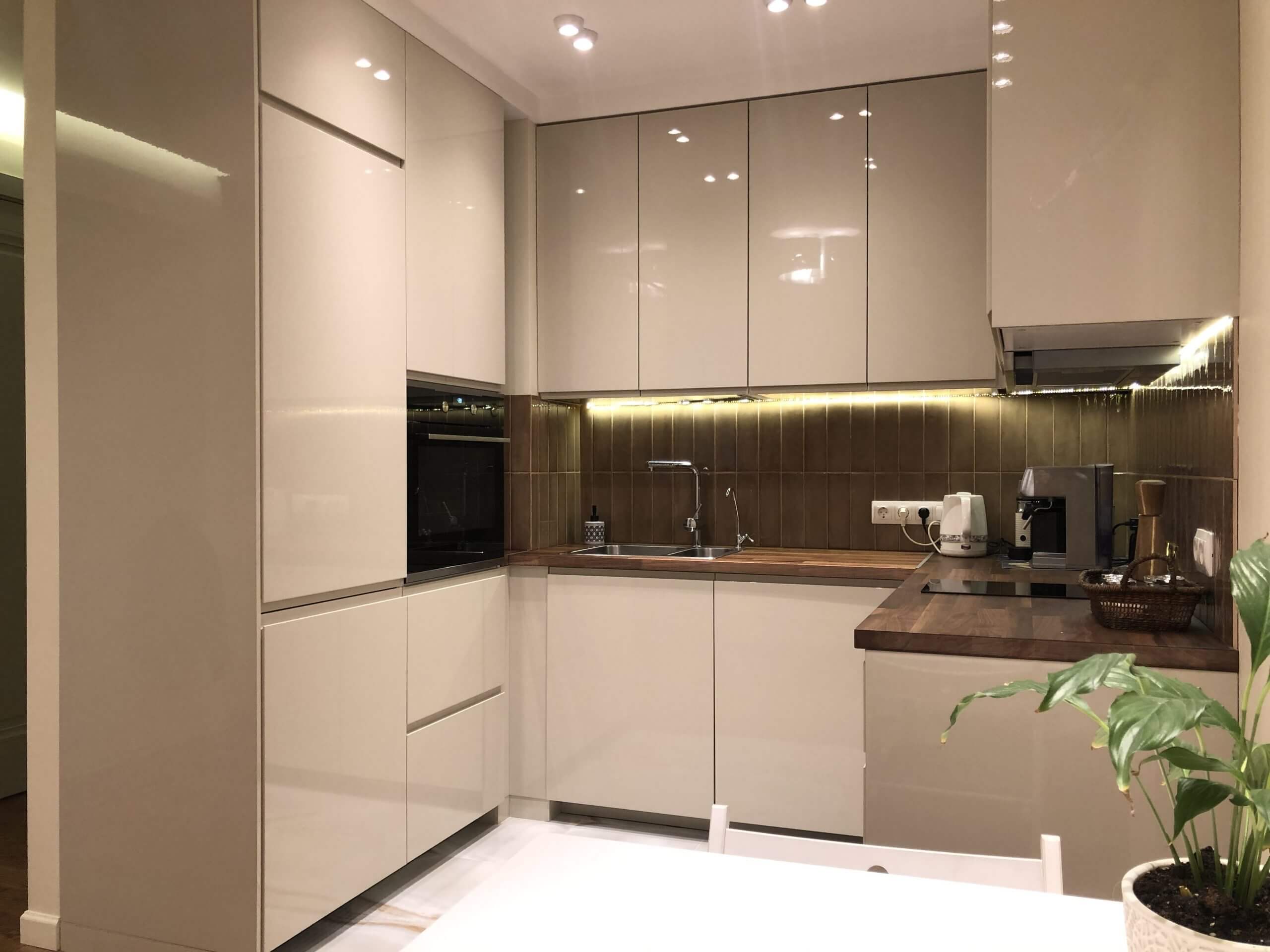 - Перегородка, разделяющая кухонную зону и гостиную, облицована широкоформатной плиткой